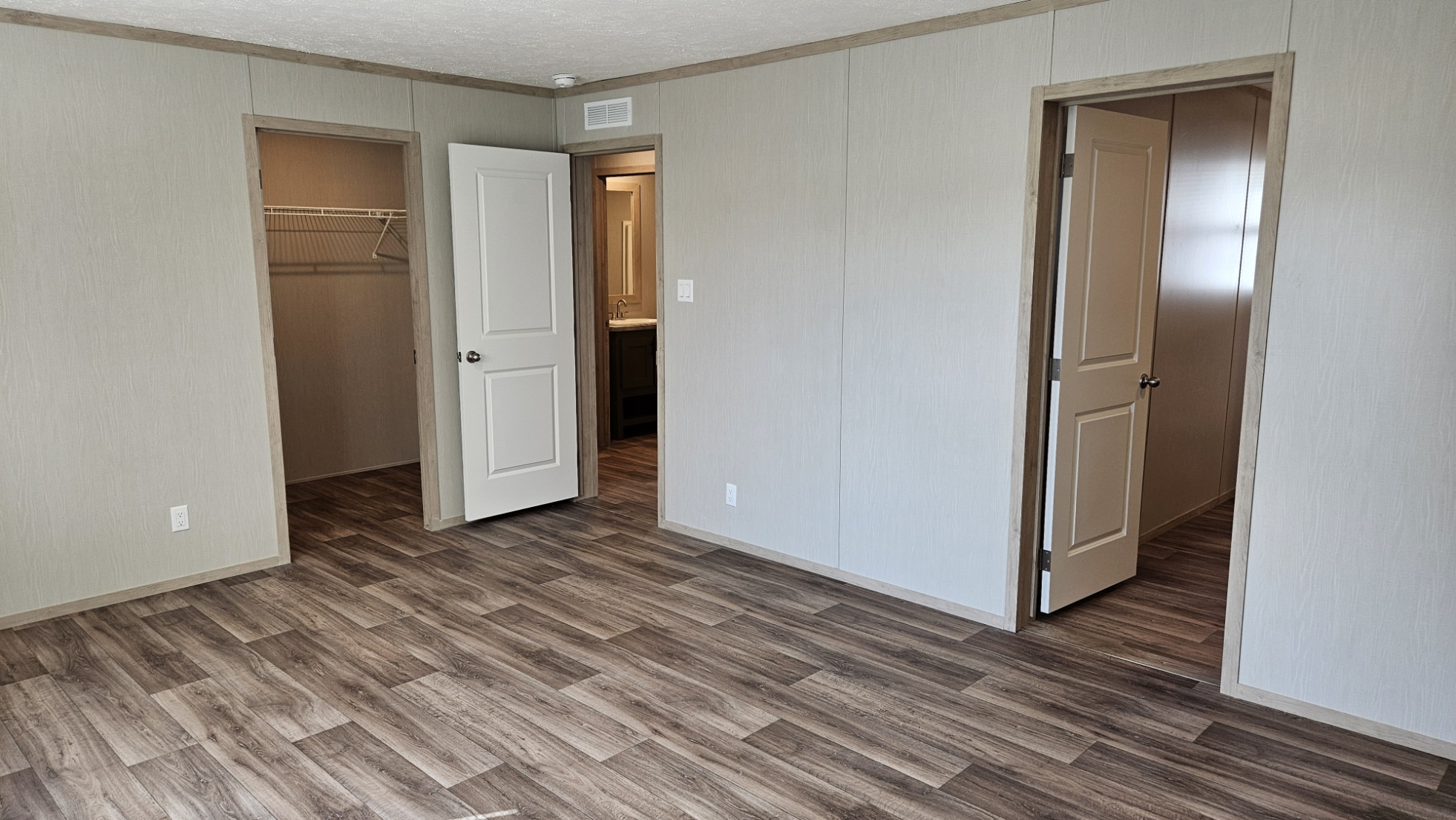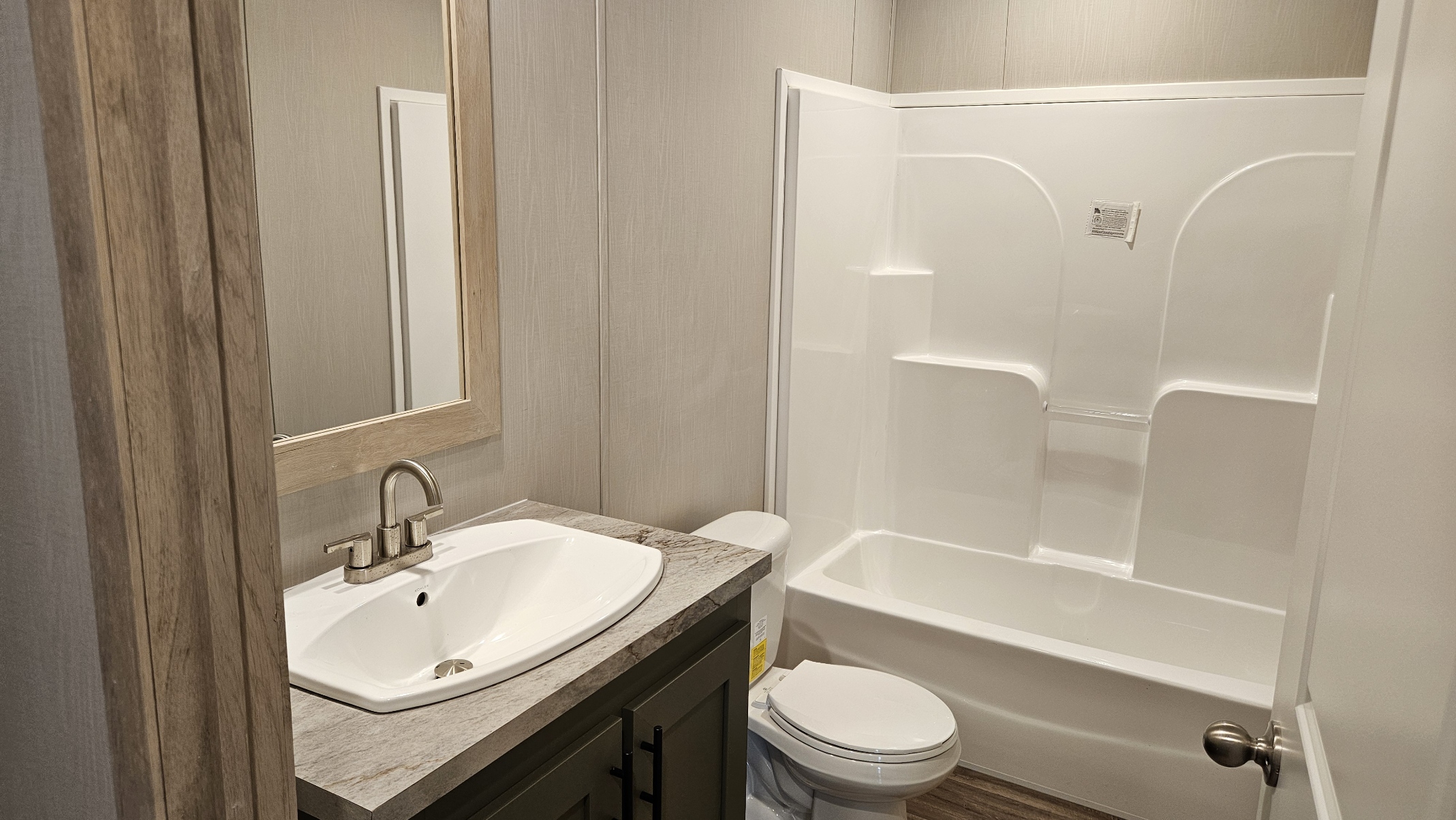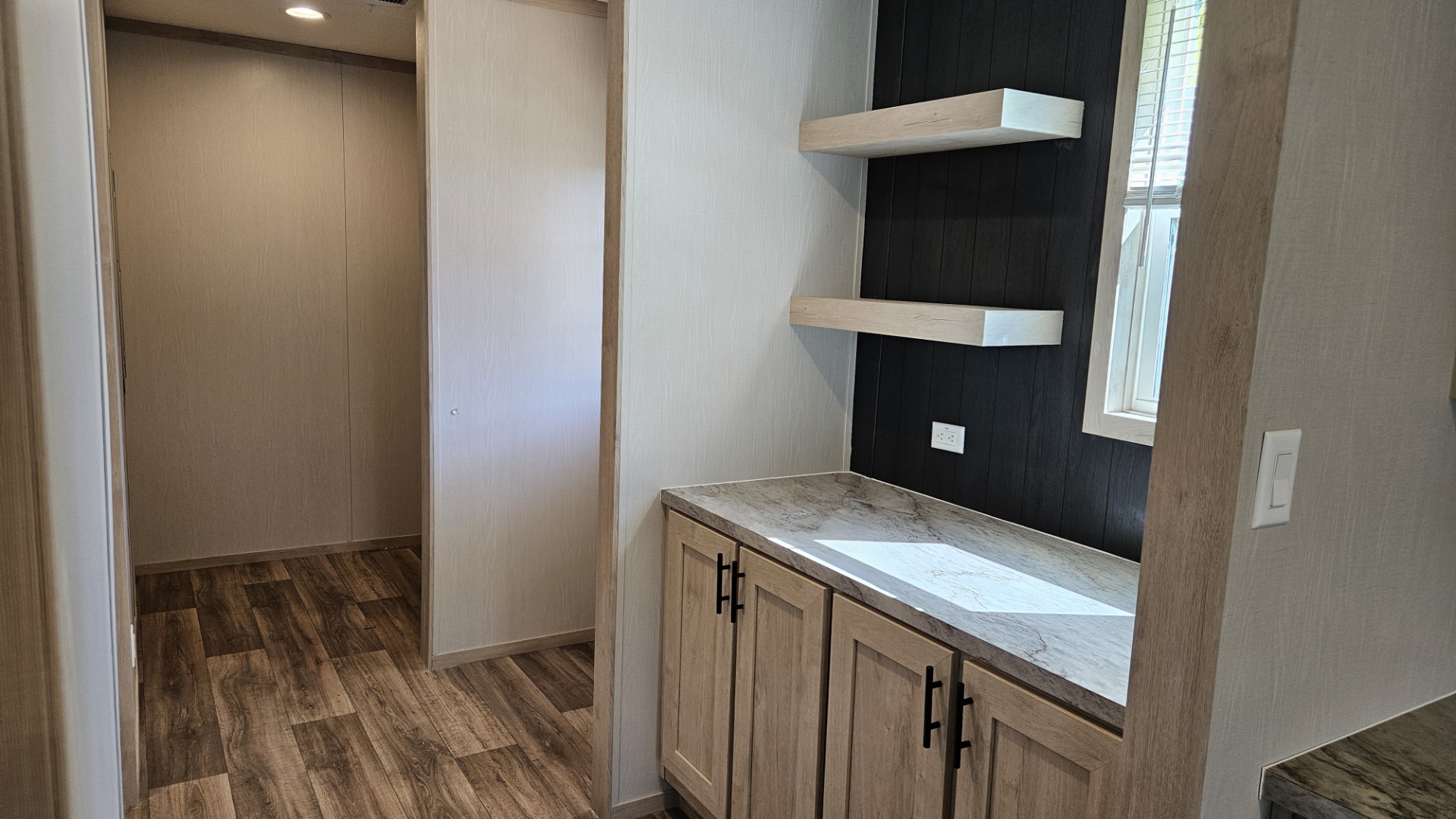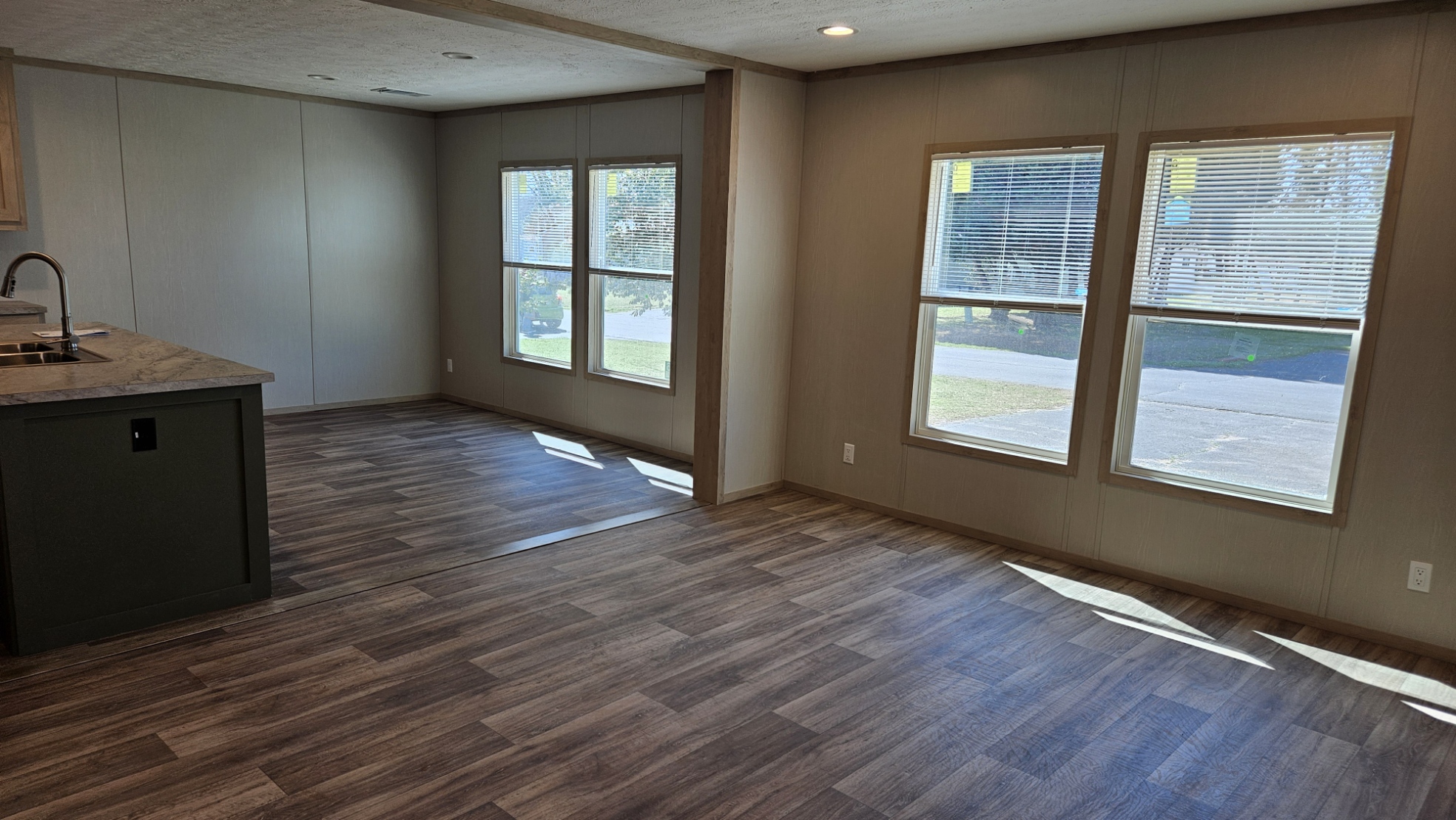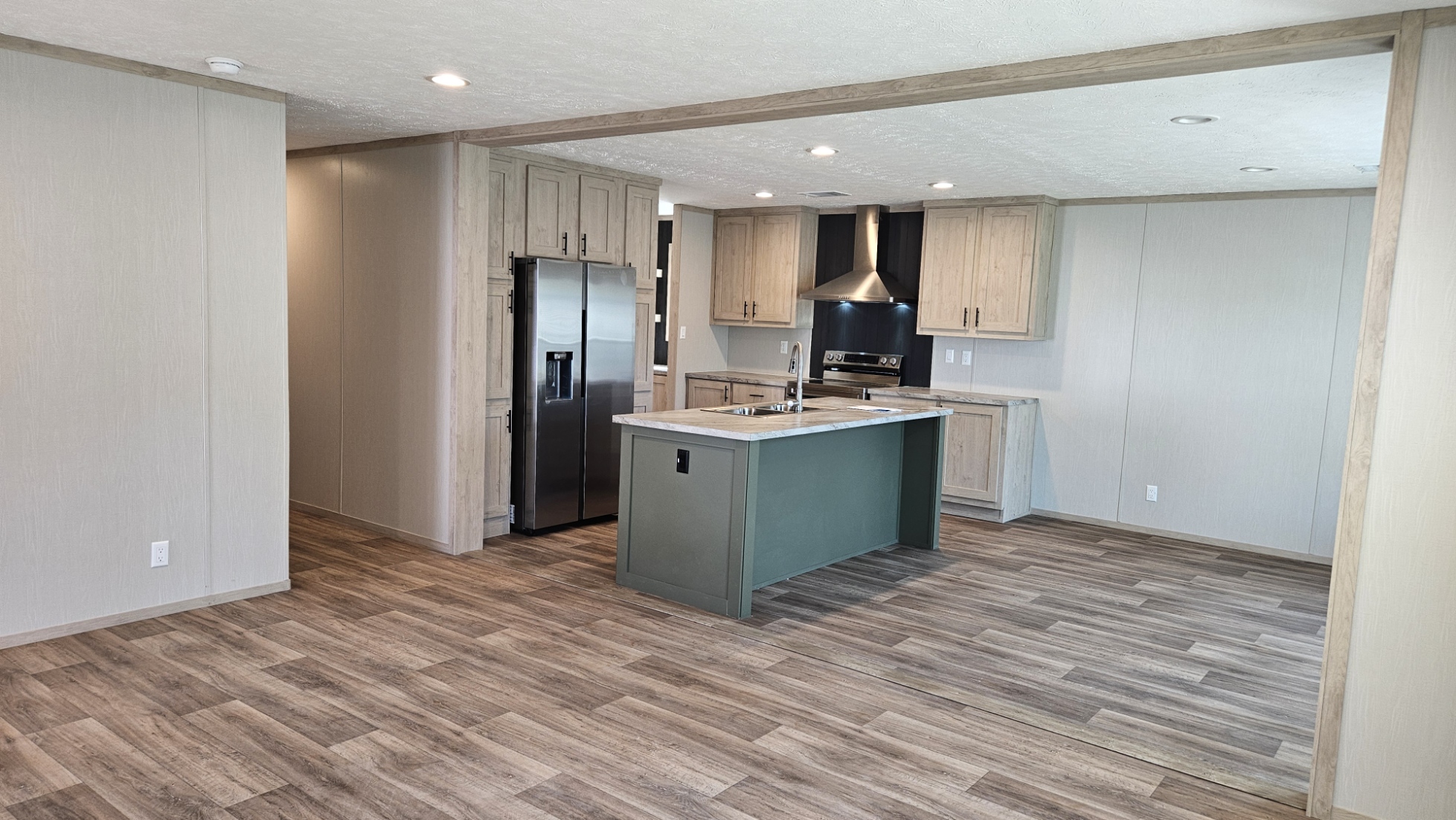 This new Clayton Cook home on lot #166 is currently available for sale at Kingsridge Park for $125,000. The photos on this page show a bright, open living space, a kitchen with a large island (with sink), stainless-steel appliances, modern cabinetry, and a built-in counter area with floating shelves.